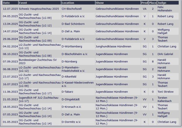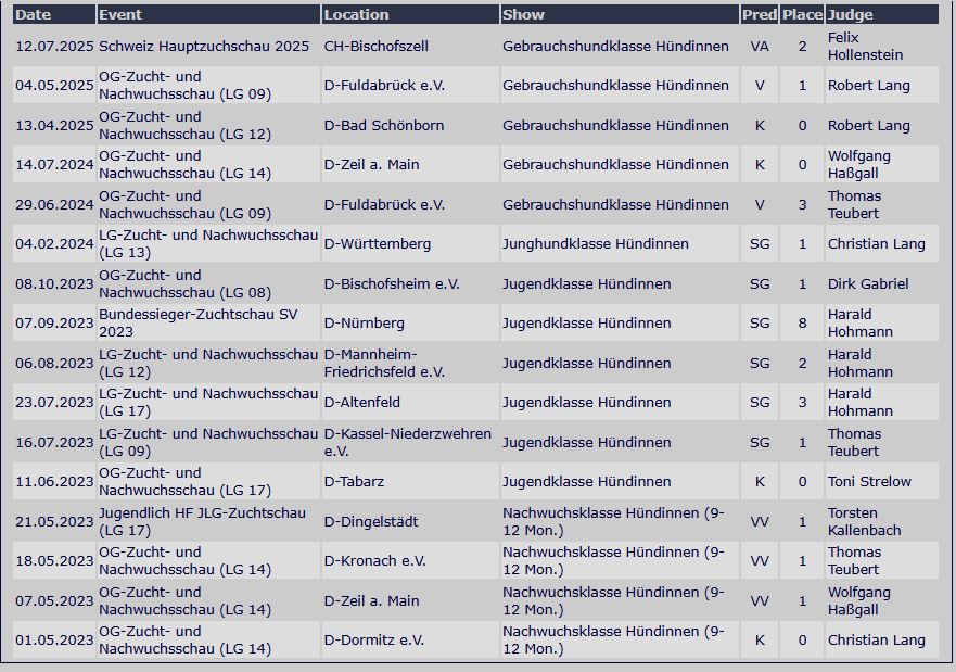 Celina ist eine überaus typvolle, knochenkräftige und gehaltvolle Mio-Tochter mit femininem Erscheinungsbild. Die Hündin fällt durch den korrekten Gesamtaufbau, die gerade Linienführung und idealen Winkelungen der Vor- und Hinterhand bei fester Gelenkbildung auf. Ihre Körperharmonie verleiht ihr die Möglichkeit, raumschaffende, äußerst kraftvolle Gänge vorzutragen.